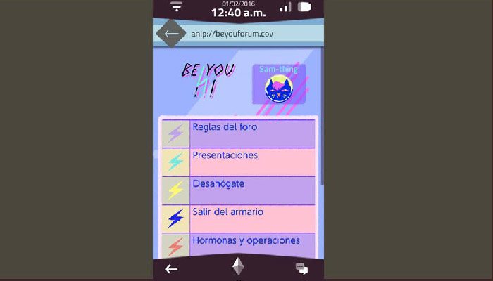 La historia de Sam no es lo que parece a primeras. Conforme vamos leyendo sus mensajes, vamos oliéndonos que algo raro ha pasado en su vida, algo que le ha descolocado totalmente y que le hace estar perdido. Y es que en un punto concreto de la historia, Sam descubre que realmente es Samina. Si, la historia va sobre como un chico descubre su transexualidad. La manera de presentarlo es bastante natural, vemos la evolución en su pensamiento, como empieza a plantearse algunas cosas a partir de una experiencia que relata, como comienza a explorar su situación, verse en un entorno muy homófobo y recurrir a las comunidades de internet para encontrar apoyo... algo que desgraciadamente, muchos jóvenes transexuales tienen que vivir, el desconocimiento hacia el colectivo transexual y su consiguiente discriminación es una de las grandes lacras de la sociedad de hoy, una de las tareas pendientes que tenemos que enmendar en los años venideros, y juegos como este ayudan a ver ese otro lado y comprender mejor lo que se siente. De hecho, a manera personal, me he sentido bastante identificada. No soy transexual, pero a lo largo de mi vida he vivido en cierto modo esa discriminación ya que por mi forma de ser, mis gustos y mi personalidad en multitud de ocasiones me he sentido discriminada por no compartir los roles de género.