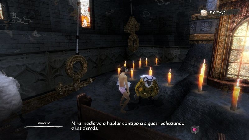 Una a la que deberemos enfrentarnos en la piel del propio Vicent, armado con una almohada y luciendo cuernos de carnero entre sus rizos, tras resultar infiel con Catherine y acudiendo cada noche a un terrible desafío a través de un brillante diseño de niveles que nos llevará a escalar una serie de torres divididas en bloques —enfatizando constantemente en ese juego metanarrativo que tanto gusta valerse del simbolismo— y a los que deberemos adaptarnos para conseguir llegar al final. Pero, de eso, hablaremos más tarde.