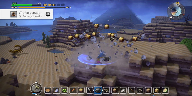 Con todo, encontraréis tremendamente adictivo el localizar y almacenar todo tipo de materiales, retocar la base para dejarla a vuestro antojo y fortificarla de la mejor forma posible. Para ello requeriremos de herramientas y de energía. En 'Dragon Quest Builders' nos encontraremos zonas que no se pueden explotar sin la herramienta adecuada, por lo que tendremos que adquirir los últimos avances en nuestra base. El otro aspecto a tener en cuenta es la energía. Si salimos a abastecernos y no tenemos en cuenta nuestro estómago, lo pasaremos mal, por eso siempre hay que ir con algo de comida en la mochila.