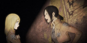 Una vez sin titán y con Reiner herido, Krista le cura las heridas usando como venda un trozo de su falta, ruborizando con eso a Reiner y haciendo que Ymir también le pida que la cure, aquí es donde vemos un poco más los sentimientos de Ymir hacía ella, cortados de golpe por Connie, quien dice que eso con un poco de saliva ya está.