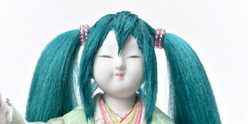 Mientras que las hina ningyo suelen ser mostradas en pareja -emperador y emperatriz-, Hina Miku se vale por sí misma para mostrar su alegre sonrisa a través de las formas redondeadas de su rostro, que contrastan con el diseño estilizado y alargado de Hatsune Miku, No faltan su cabello verdoso y sus largas coletas.