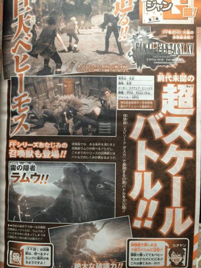 Según la revista Jump, ésta podría ser nada más y nada menos que el señor del rayo, Ramuh. En el número de la revista muestra una imagen del que será el compañero que podremos invocaro, siempre y cuando cumplamos una serie de condiciones.