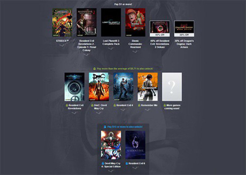 Si por otra parte queremos el resto de títulos hemos de pagar, como siempre, la cantidad media variable que se está donando. Al tiempo de redactar esta noticia, esa cantidad se encuentra en los 8'71$, y nos dará, además de todo lo que ya hemos dicho antes, el primer 'Resident Evil Revelations', 'DmC: Devil May Cry', 'Resident Evil 4', 'Remember Me', y otros juegos que aún están por revelar. Por último, si optamos por depositar una cantidad fija de 15$ nos llevaremos 'Devil May Cry 4: Special Edition' y 'Resident Evil 6', así como el resto del bundle, evidentemente.