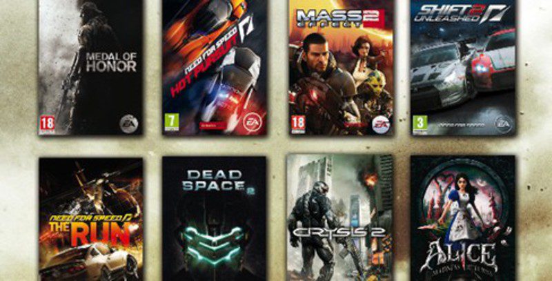 Por 19,99 euros se podrá adquirir cada uno de los siguientes títulos: 'Medal of Honor' (PS3, Xbox 360), 'Medal of Honor Tier 1 Edition' (PS3, Xbox 360), 'Need for Speed Hot Pursuit' (PS3, Xbox 360), 'Need for Speed Hot Pursuit Edicion Limitada' (PS3, Xbox 360), 'Mass Effect 2' (PS3), 'Dragon Age II' (PS3, Xbox 360), 'Dragon Age 2 Signature Edition' (PS3, Xbox 360), 'Shift 2 Unleashed' (PS3, Xbox 360), 'Shift 2 Unleashed Edición Limitada' (PS3, Xbox 360), 'Dead Space 2' (PS3, Xbox 360), 'Dead Space 2 Edición Limitada (PS3), 'Fight Night Champion' (PS3, Xbox 360), 'Crysis 2' (PS3, Xbox 360), 'Alice: Madness Returns' (PS3, Xbox 360), 'Shadows of the Damned' (PS3, Xbox 360), 'Los Sims 3 ¡Vaya Fauna!' (PS3, Xbox 360), 'Los Sims 3 ¡Vaya Fauna! Edición Limitada' (PS3, Xbox 360), 'Need for Speed The Run' (PS3, Xbox 360), 'Need for Speed Edición Limitada' (PS3, Xbox 360).