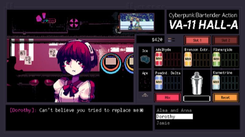 Toca hablar de juegos independientes curiosos, y esta vez le ha tocado a 'VA-11 HALL-A', que bajo el subtítulo de Cyberpunk Bartending Actio nos muestra un simulador de barman con fuerte inspiración en las aventuras conversacionales japonesas y en los títulos de aspecto cyberpunk. Desde el pasado verano, el juego está en una fase de financiación en la que el equipo vende el juego por cinco dólares desde la web oficial, que además el enlace de descarga que se envía al correo vendrá con el juego final cuando esté terminado en los próximos meses, además de que se recibirá una key de Steam cuando el juego esté publicado a un precio de trece dólares en la tienda digital de Valve.