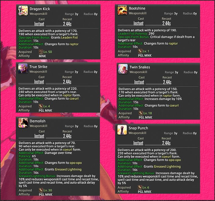 Dragon Kick primero, luego el ataque que queramos de la forma raptor y luego terminamos con la forma coeurl. Al volver a la opo-opo, hacemos Bootshine que, ahora sí, hará más daño que Dragon Kick y encima podrá ser crítico si es desde la espalda.