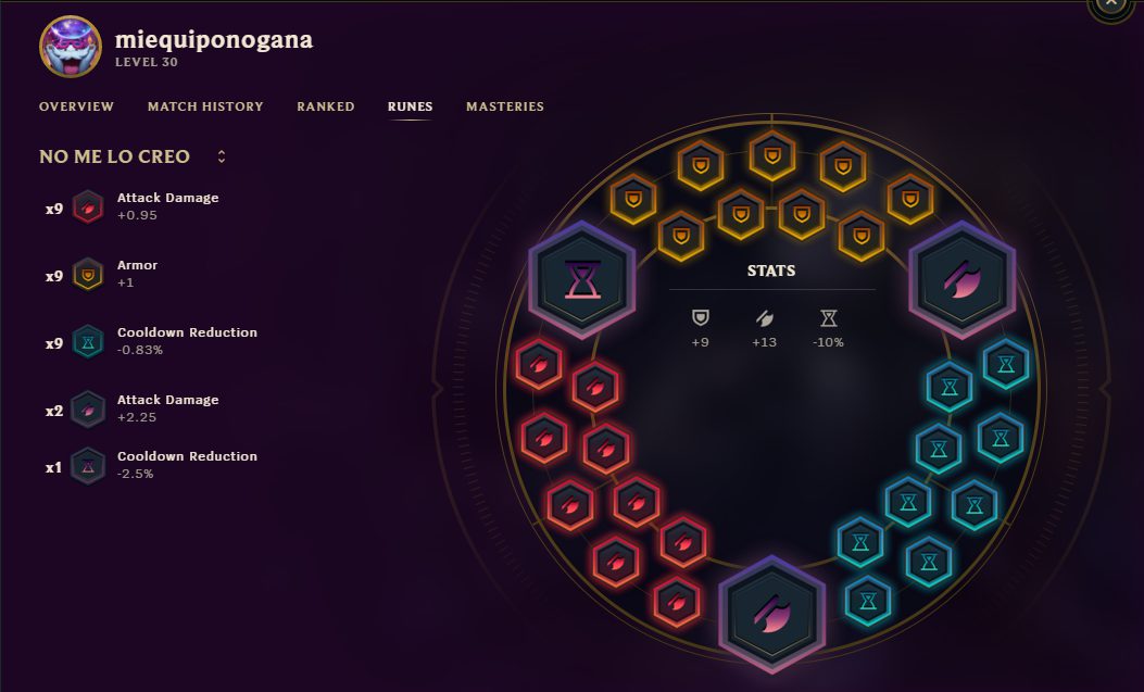 Quizás os extrañe el porqué del 10% de Reducción de Enfriamientos en las runas, el objetivo con Riven es conseguir el 45% de CDR lo antes posible para poder utilizar las habilidades de las que tanto depende Riven para hacer daño. Aproximadamente, gracias a estas runas, solo con 2 items llegareis, sin siquiera la necesidad de terminarlos, al máximo de reducción de enfriamientos pudiendo abusar muchísimo al comienzo de la partida si conseguís algo de ventaja.