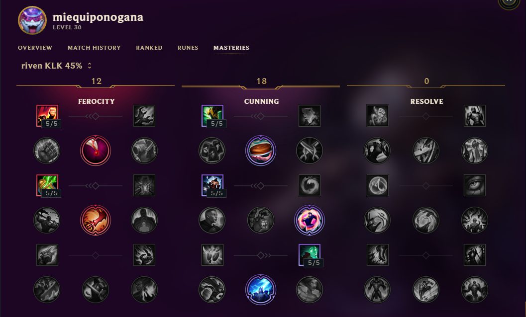 La maestría por excelencia para Riven es el Decreto del Señor del Trueno ya que el 45% de CDR es bastante necesario en este campeón. Los puntos restantes los emplearemos en el árbol de ferocidad, ganando velocidad de ataque extra para que el combo sea aún más fluido y algo de sustain en linea.