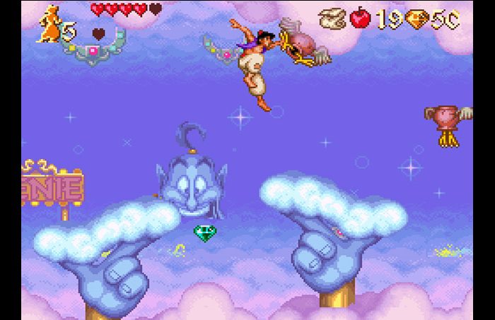 Para acabar un par de detalles muy importantes. Por un lado, que aunque el juego sigue el guión de la película en la que se basa, también es muy recomendable porque se sale completamente del guión en un par de fases. Dos fases memorables, por cierto. Hablamos de la pirámide egipcia (una de las más complicadas del juego), y el fantástico mundo surrealista del Genio, que gustará a los amantes de ese personaje en concreto, y que además suponía una buena inyección de originalidad y variedad en un título ya de por sí bien diseñado en cuanto a sus niveles se refiere. El segundo detalle, seguramente no sea tan importante para el juego en sí, pero sí ayude un poco a comprender porque algunos juegos de Disney los desarrollaba Capcom, y otros no. Y la razón en realidad es muy sencilla: hubo una época en la que Capcom tenía los derechos de licencias para juegos en consolas de Nintendo basados en propiedad intelectual de Disney. El que 'Aladdin' fuera uno de ellos, es simplemente porque la película salió en uno de esos momentos. De ahí que sea uno de los pocos que es tan distinto en una plataforma y en otra. ¿Sabéis cuánto vendió en su día? 1,75 millones de unidades alrededor de todo el mundo. Desde mi punto de vista, insuficiente con respecto a la calidad que tenía. Aunque hay que entender, que en aquella época era una cifra mucho más elevada de lo que sería ahora.