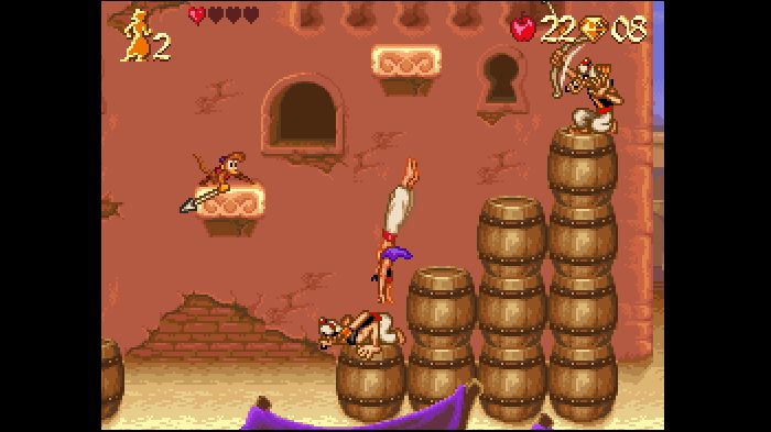 La principal fuente de crítica con respecto a la versión de Mega Drive, fue sin lugar a dudas la ausencia del sable mítico de 'Aladdin'. Pero desde mi punto de vista eso aumentó las cualidades del juego a nivel "plataformero". Más que nada, porque como sustitutivo se añadió la posibilidad de saltar sobre la cabeza de los enemigos para batirlos, y eso hacía que muchas veces encadenáramos ese salto con otro posterior. Si además, le sumabas el hecho de que la animación que provocaba en pantalla era realmente fluida y espectacular, el resultado se trasladaba directamente a la jugabilidad explosiva del título. Por otra parte, en ambas versiones era posible lanzar manzanas para aturdir a los enemigos (algo que se mantuvo hasta en juegos de 'Aladdin' en 3D). Como bien había dicho antes, una mezcla perfecta entre lo que sería un juego más arcade, y un plataformas de toda la vida. Por si fuera poco, también hacía acto de presencia la famosa alfombra mágica, que era capaz de trasladarnos a zonas inaccesibles, y además el juego escondía múltiples secretos que solo serían desvelados si encontrábamos todos los diamantes del escenario, por ejemplo.