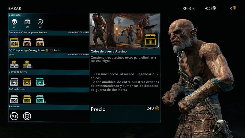 En los últimos días he leído en múltiples ocasiones que no se puede completar el juego sin pasar por caja. Confirmo que eso es totalmente falso. Lo que ofrecen los cofres de guerra son orcos y piezas de equipo del mismo nivel que tiene Talion cuando los abrimos. La categoría más baja de cada tipo de botín se puede comprar con monedas del juego y estas son bastante abundantes. No es en absoluto relevante la presencia de estos pagos adicionales para completar el juego en su totalidad y tampoco para ser competitivos a la hora de elaborar fortalezas que luego otros jugadores asediarán en línea (sin causar daños, ni matan a nuestros orcos ni nos roban la fortaleza, solo ganan una recompensa si triunfan o la ganamos nosotros si fracasan).